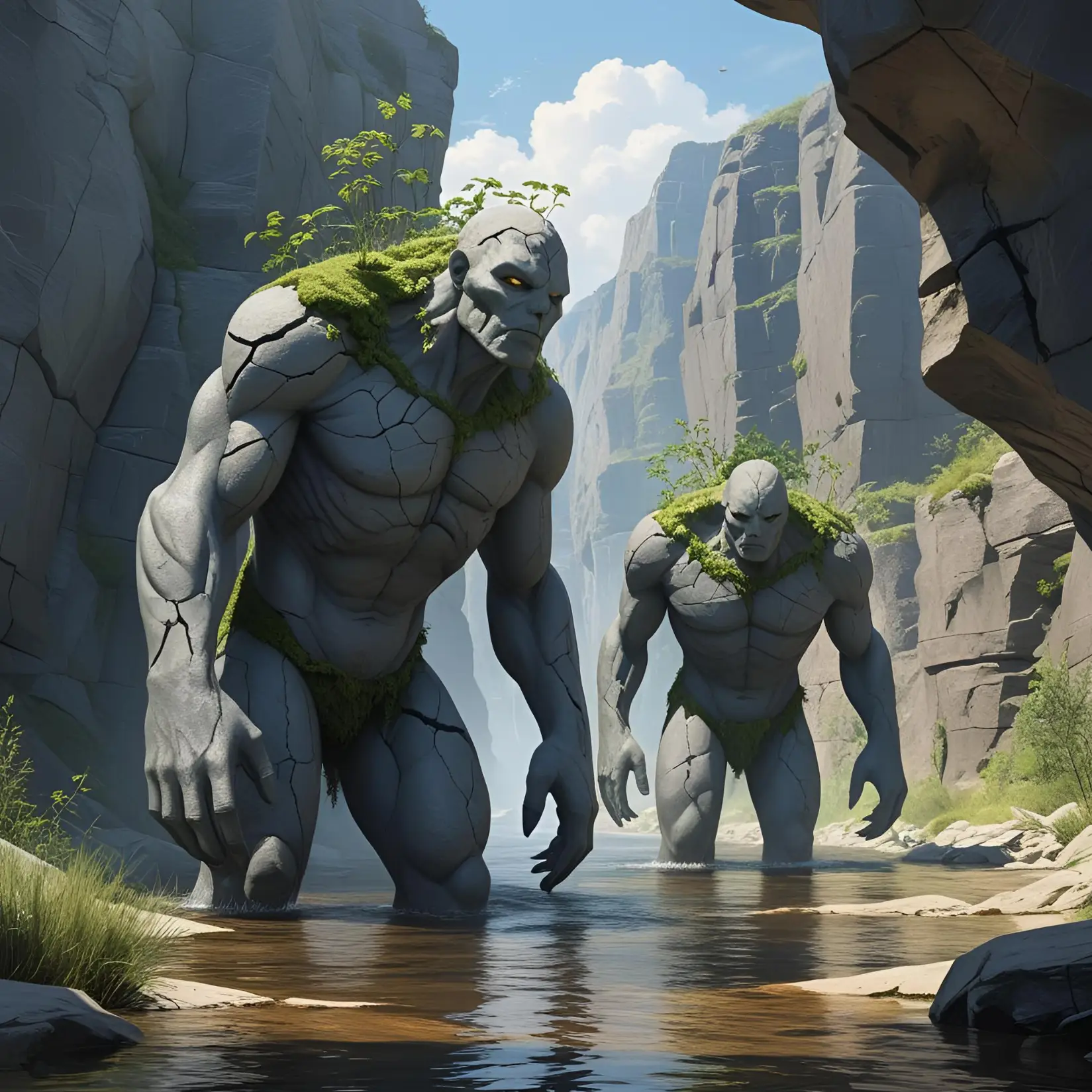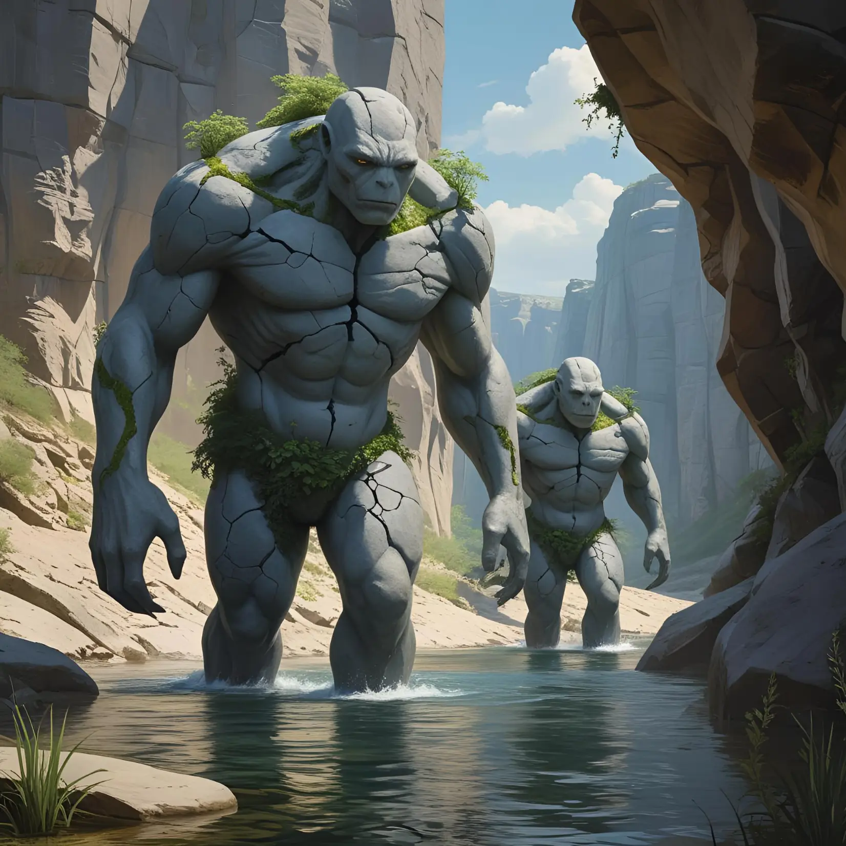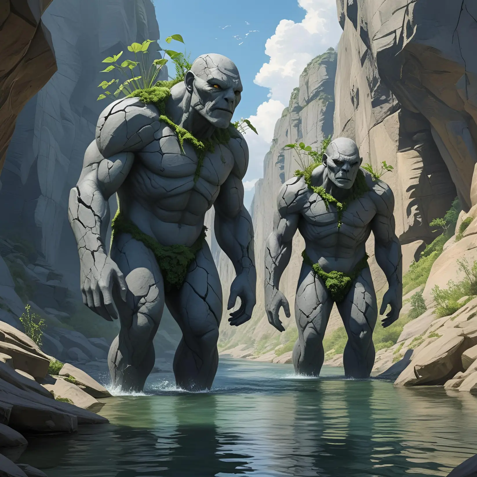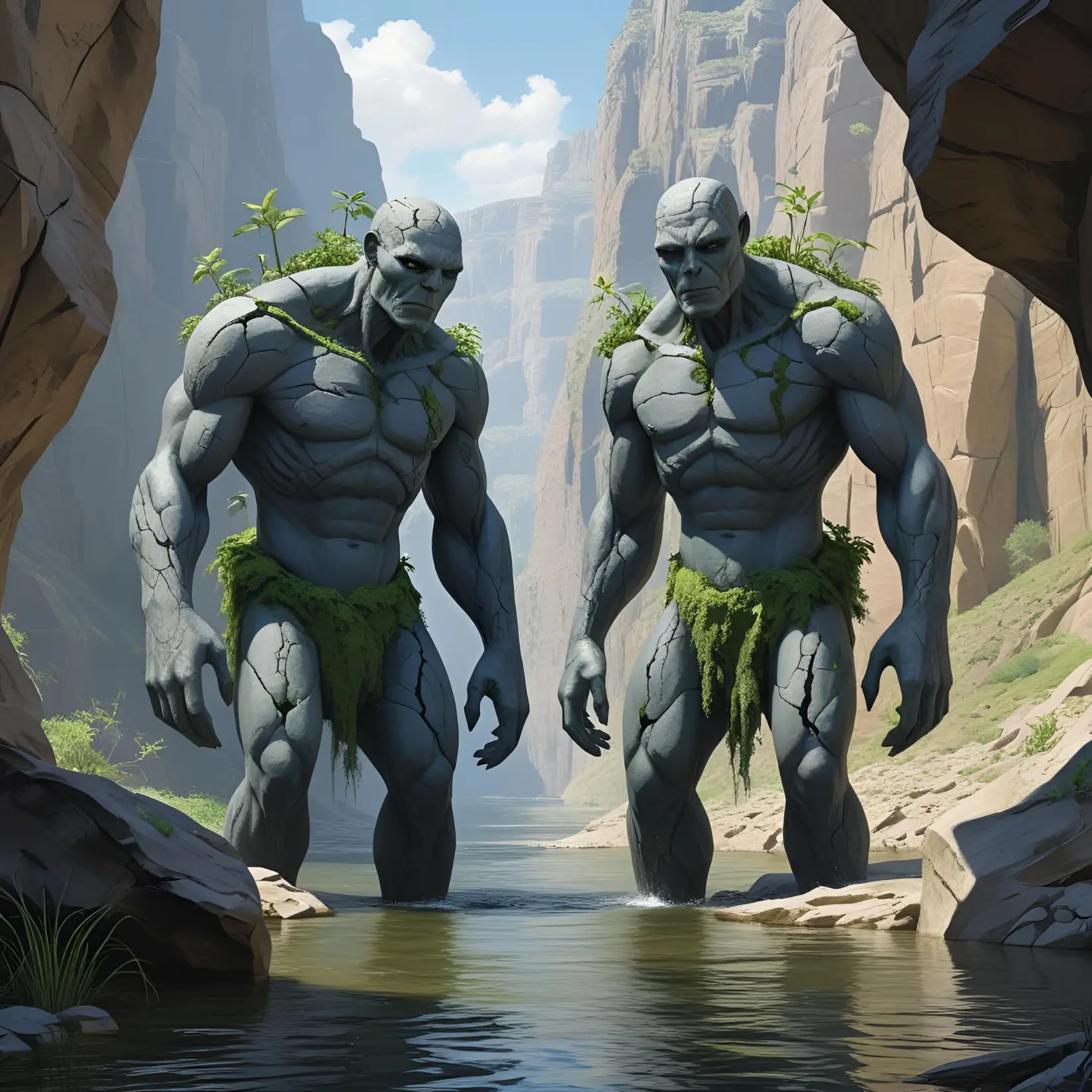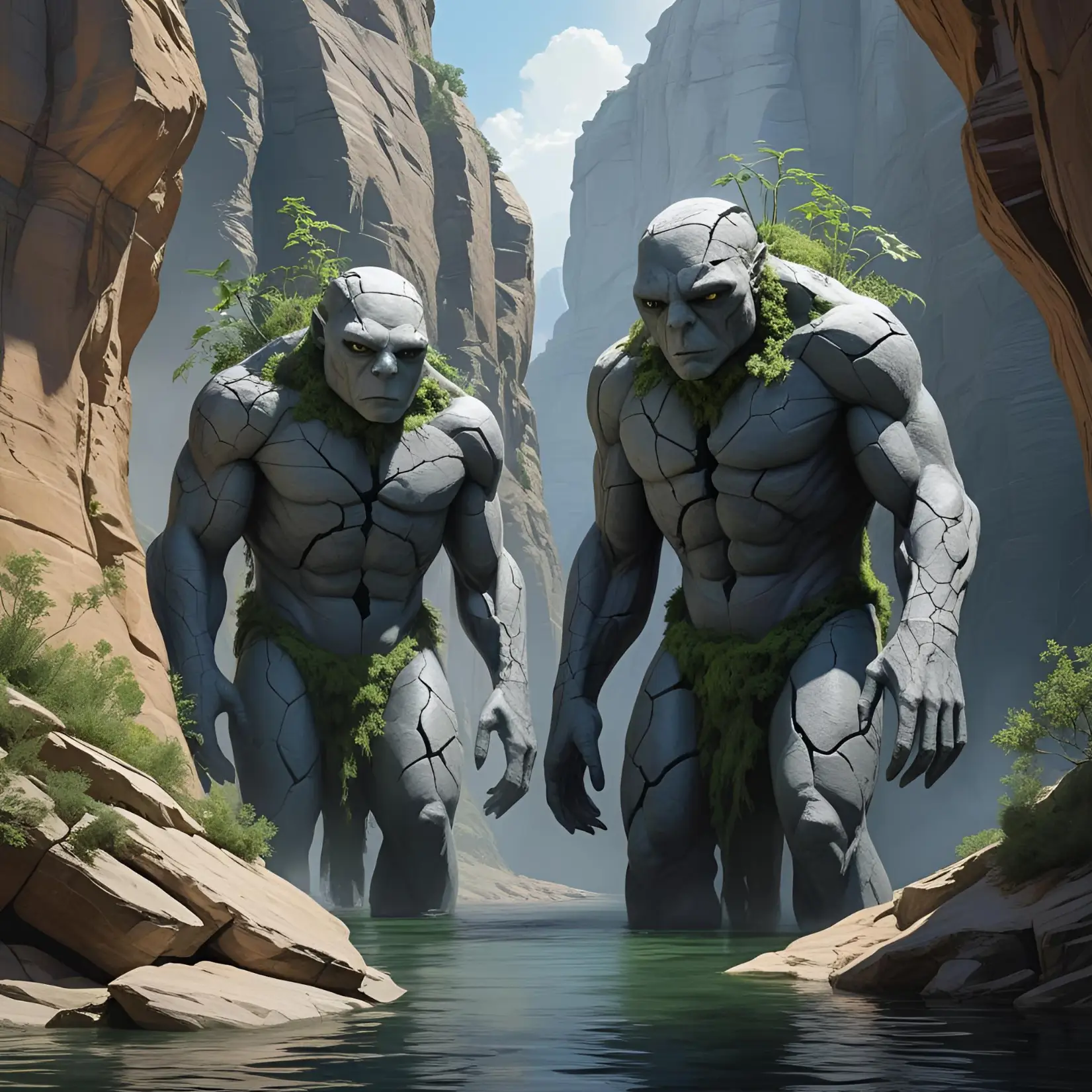 Kaya Adamlar devasa boyutları, taşlaşmış kasları ve doğanın elinden çıkmış gibi görünen formlarıyla Kayalar Kanyonu’nun canlı bir uzantısı gibidir. Duman grisi gövdeleri üzerinde derin çatlaklar uzanır; zaman zaman bu çatlaklardan bitkiler filizlenir. Bitkilerin yeşil tonları onların dinginlik ve doygunluk hâlini yansıtır. Gözleri ince oyuklardan ibarettir; boğuk ve yankılı sesleri, varlıklarını hissettirmek için fazlasıyla yeterlidir.