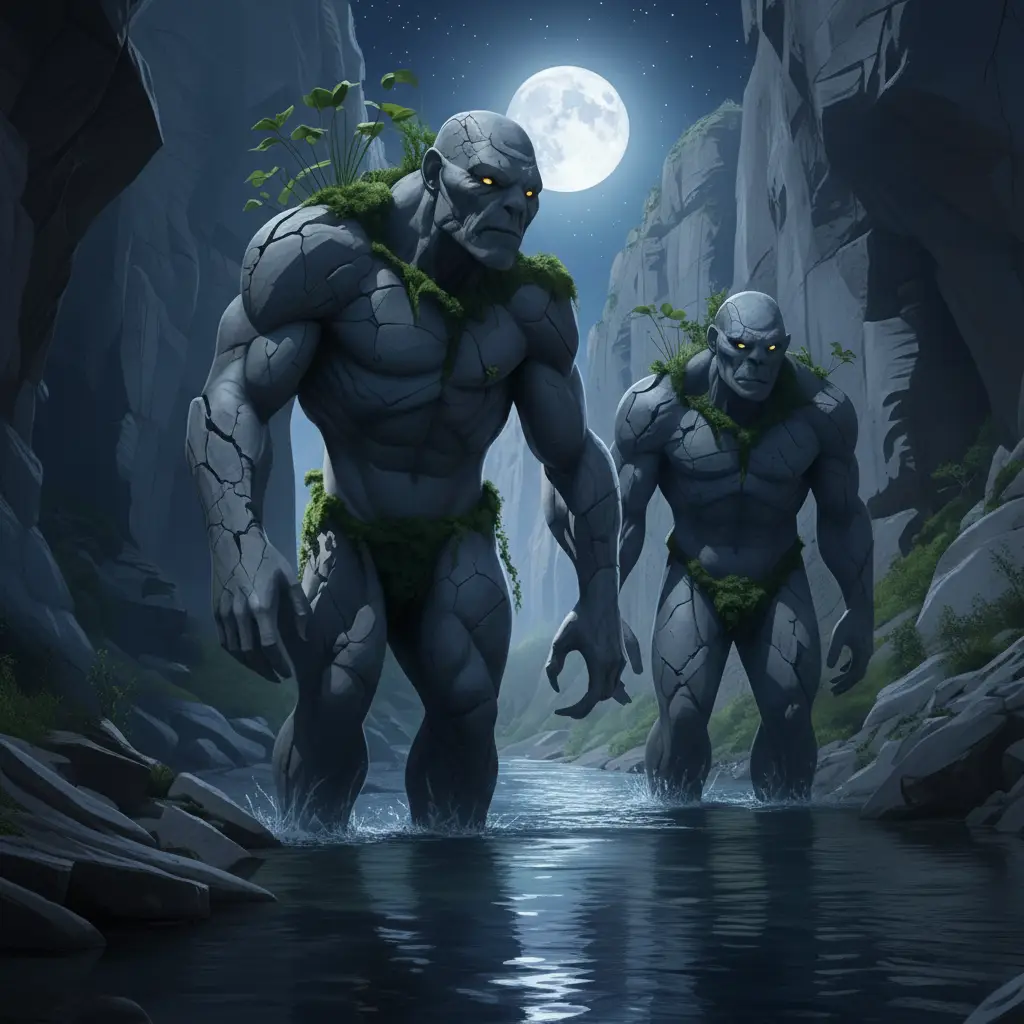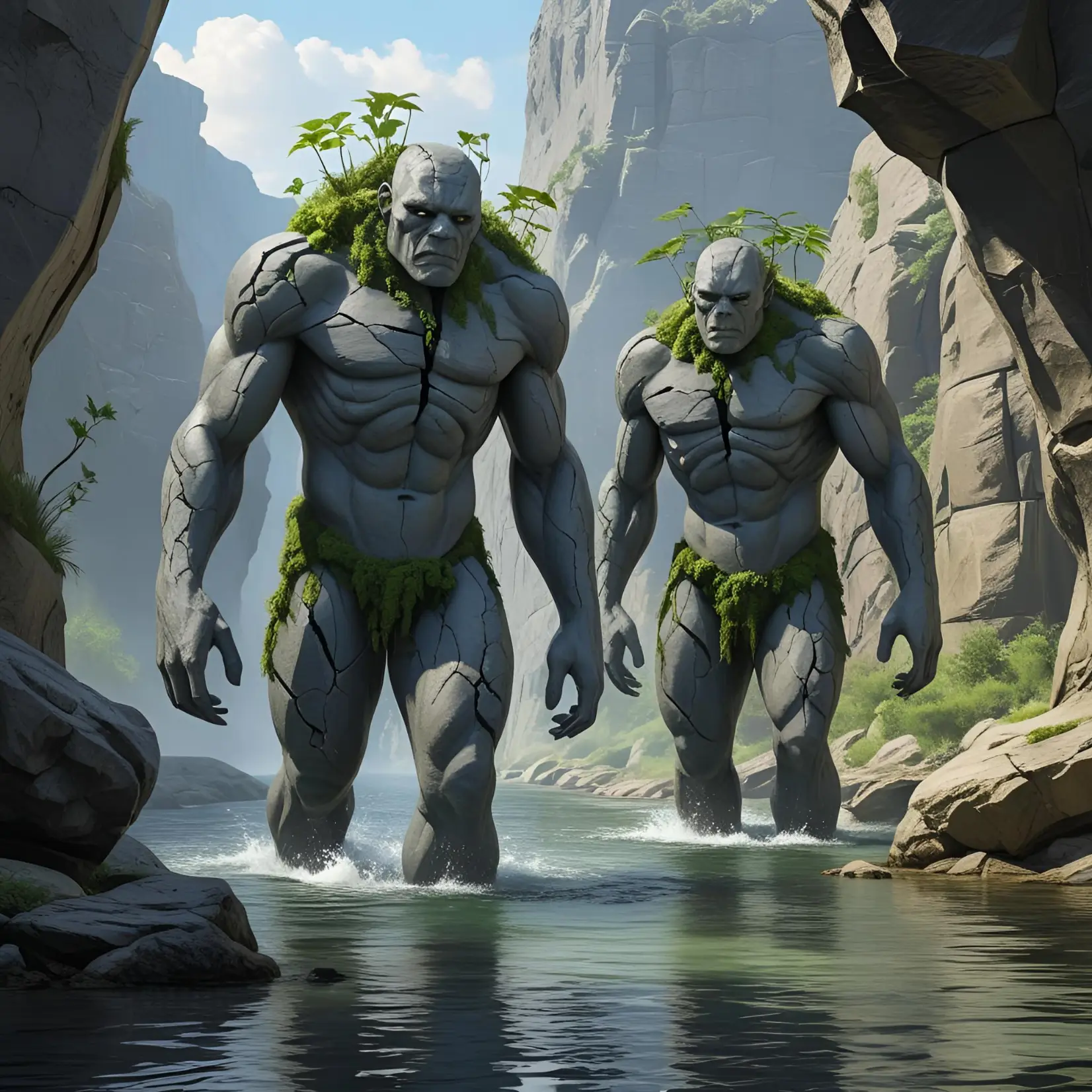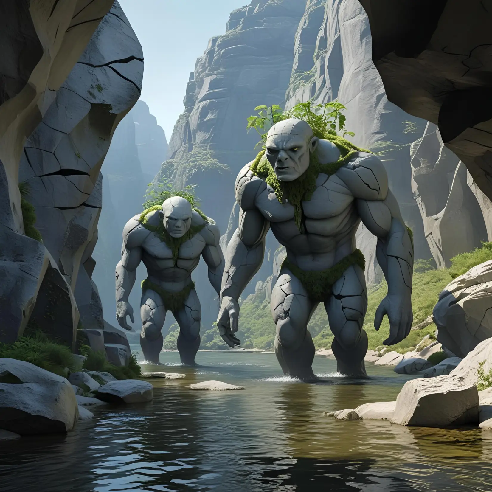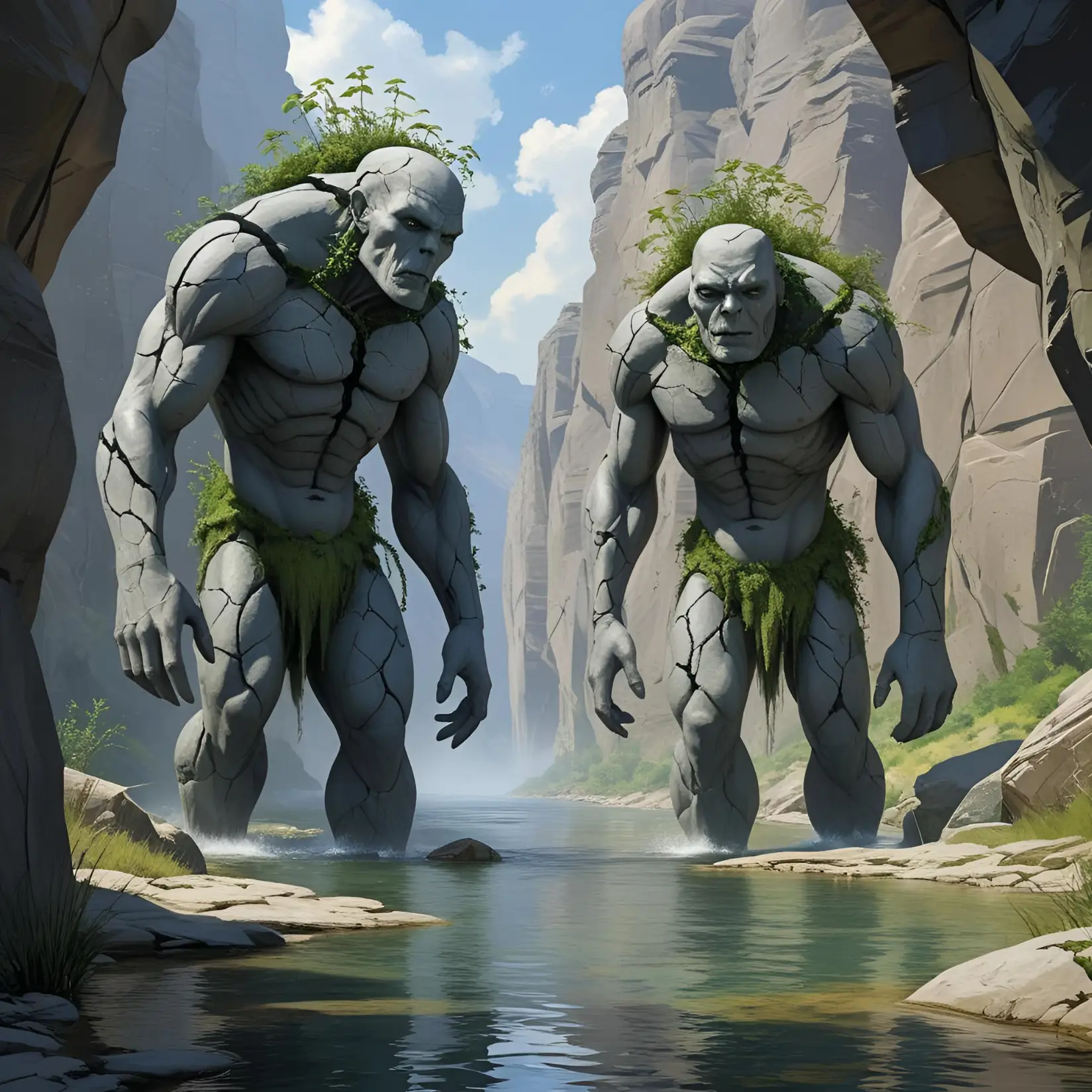 Kaya Adamlar devasa boyutları, taşlaşmış kasları ve doğanın elinden çıkmış gibi görünen formlarıyla Kayalar Kanyonu’nun canlı bir uzantısı gibidir. Duman grisi gövdeleri üzerinde derin çatlaklar uzanır; zaman zaman bu çatlaklardan bitkiler filizlenir. Bitkilerin yeşil tonları onların dinginlik ve doygunluk hâlini yansıtır. Gözleri ince oyuklardan ibarettir; boğuk ve yankılı sesleri, varlıklarını hissettirmek için fazlasıyla yeterlidir.