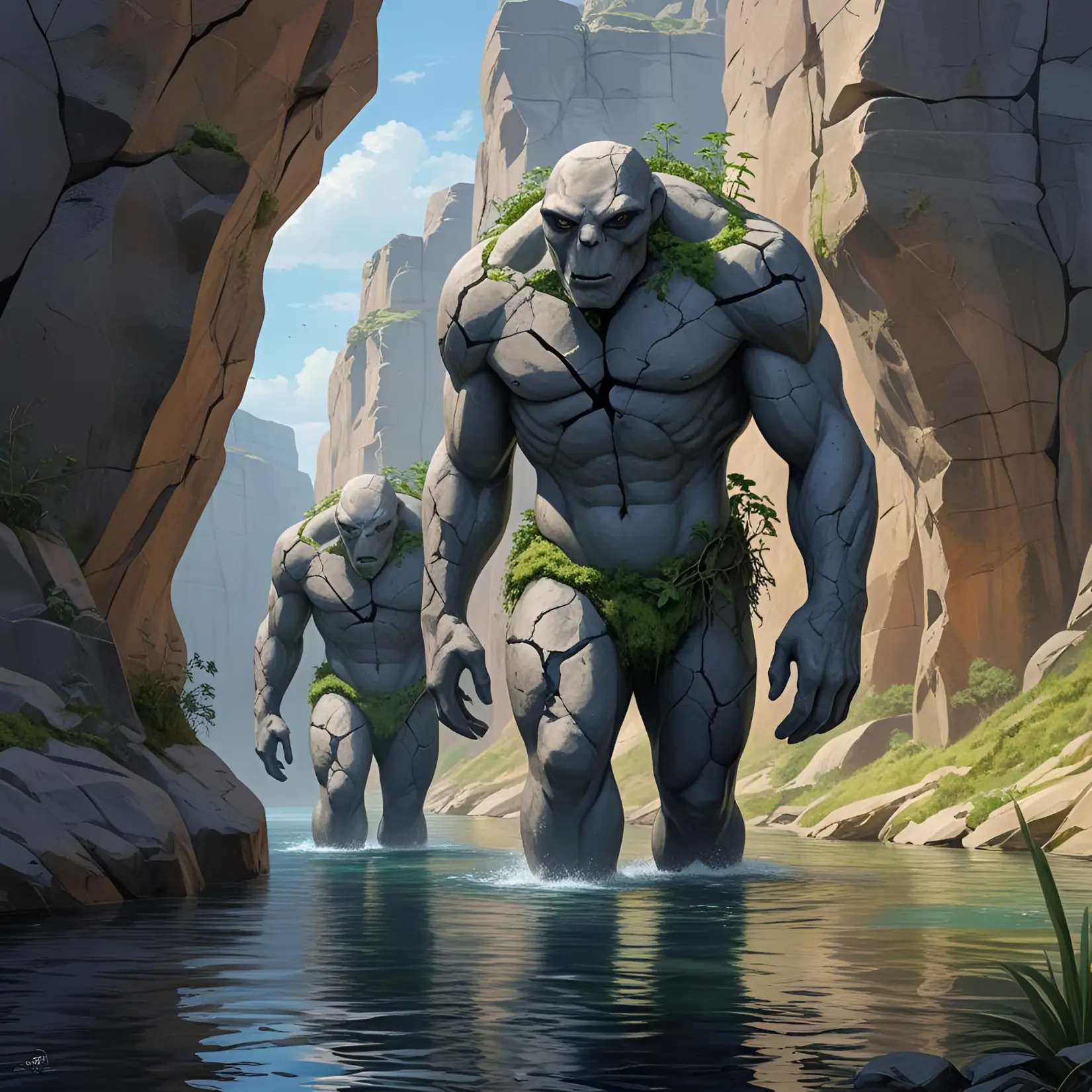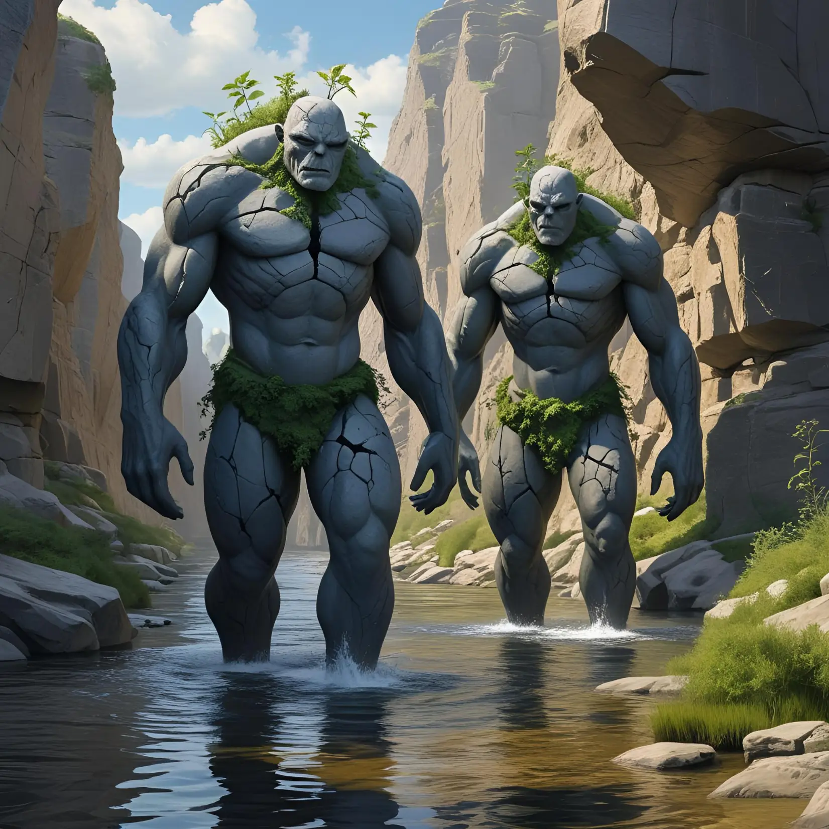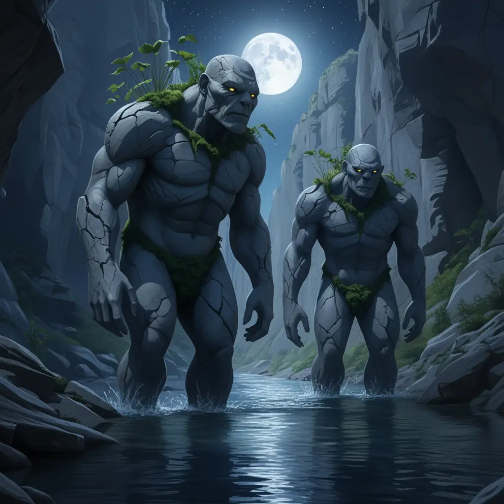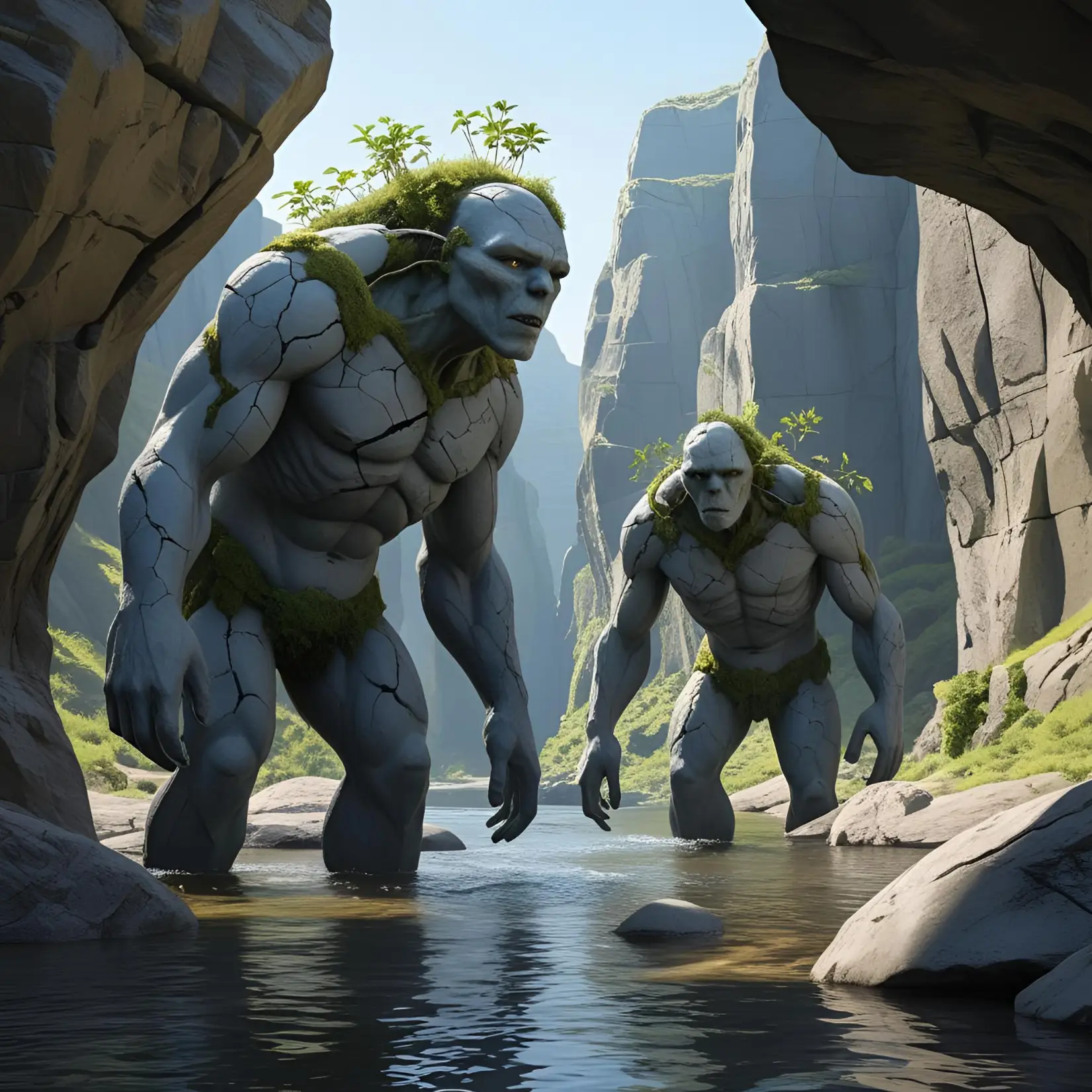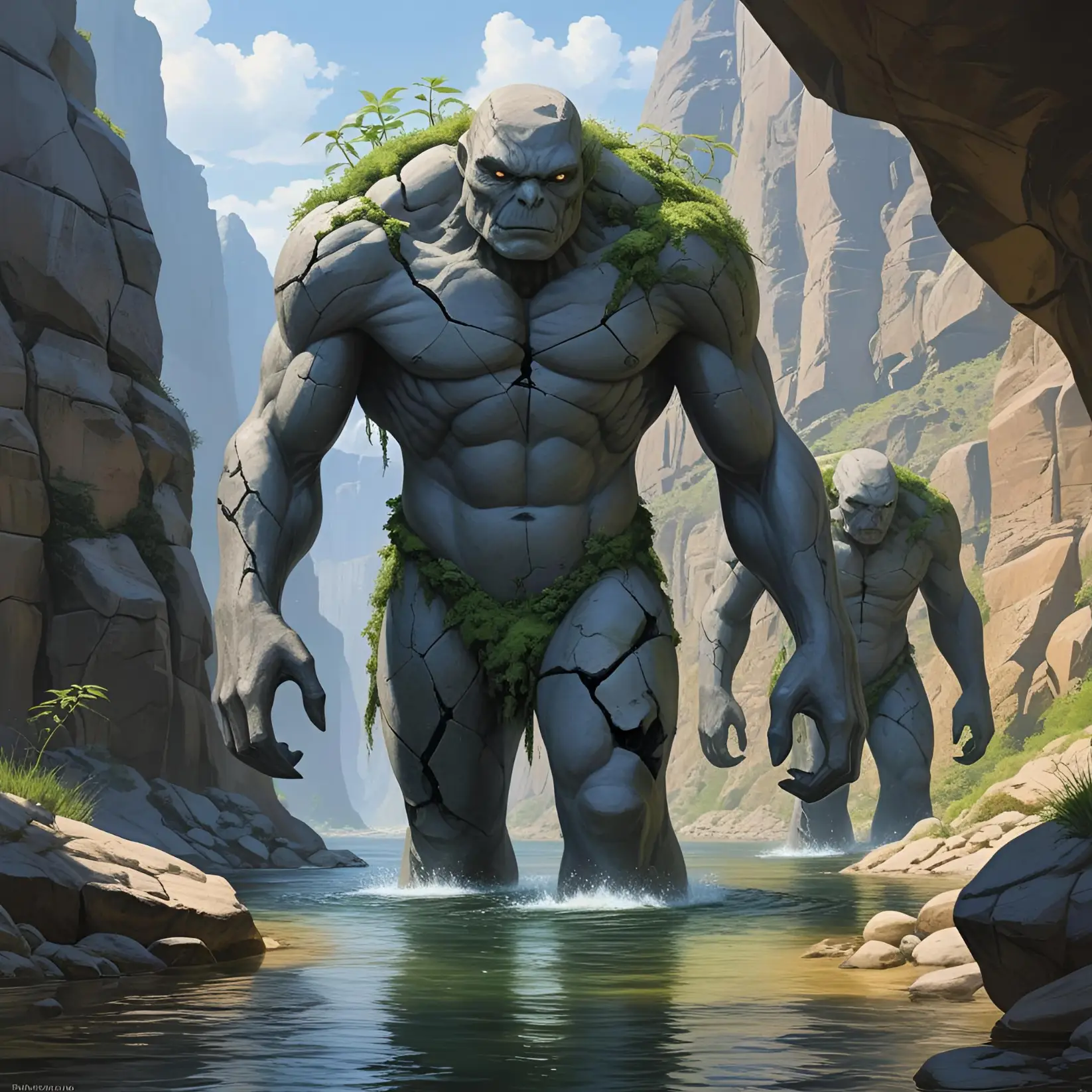 Kaya Adamlar devasa boyutları, taşlaşmış kasları ve doğanın elinden çıkmış gibi görünen formlarıyla Kayalar Kanyonu’nun canlı bir uzantısı gibidir. Duman grisi gövdeleri üzerinde derin çatlaklar uzanır; zaman zaman bu çatlaklardan bitkiler filizlenir. Bitkilerin yeşil tonları onların dinginlik ve doygunluk hâlini yansıtır. Gözleri ince oyuklardan ibarettir; boğuk ve yankılı sesleri, varlıklarını hissettirmek için fazlasıyla yeterlidir.